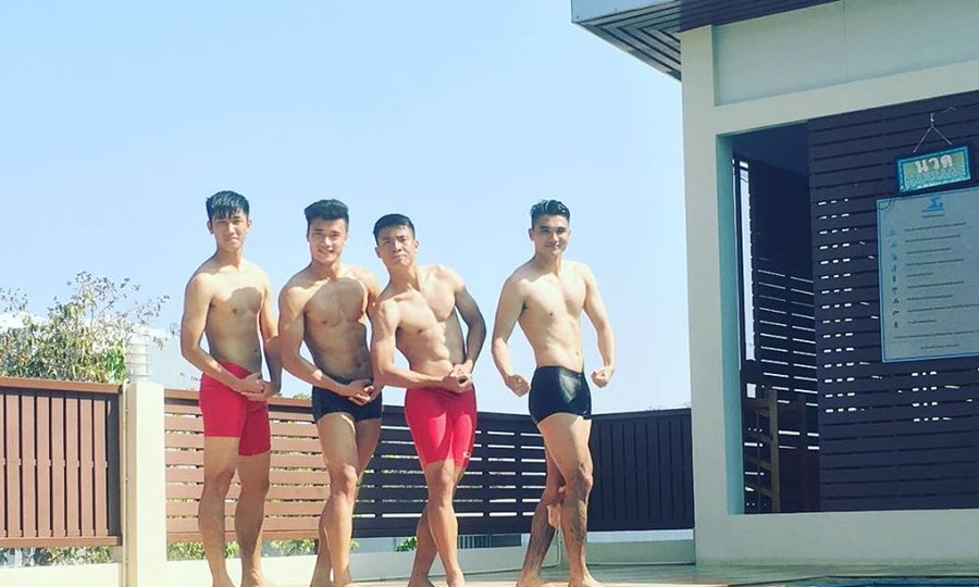 Ngoài tài năng và sự lì lợm, các tuyển thủ Việt Nam thường gây ấn tượng với mọi người bởi vóc dáng chuẩn, thân hình hoàn hảo. — Thủ môn Pei Tianshi (trái) cao 1,81 m, nặng 75 kg khiến nhiều người ghen tị. Trên trang cá nhân, anh thoải mái đăng ảnh khoe cơ bụng 6 múi cùng đồng đội.
