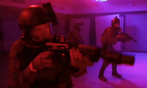 Trong video, những người lính đeo mặt nạ phòng độc đã phát động một cuộc tấn công bất ngờ, tiêu diệt những kẻ khủng bố và kiểm soát các điều kiện nhà ở trong điều kiện ánh sáng yếu. Một loạt đèn đỏ và xanh nhấp nháy kèm theo âm thanh còi báo động điếc tai, làm nổi bật các lực lượng đặc biệt tham gia khóa huấn luyện. Đây được coi là một tình huống cận chiến, giúp đội SVR giữ bình tĩnh và đảm bảo độ chính xác của từng phát bắn trong cuộc đột kích thực tế. Máy bay không người lái tưởng tượng. Họ phải tiến hành thận trọng để ngăn chặn những kẻ khủng bố trốn trong góc nhà. Các binh sĩ SVR phải đánh các mục tiêu cố định và di chuyển, sử dụng súng máy và súng lục để cải thiện khả năng cơ động và tránh rơi vào địa hình hẹp. Đến cuối năm, tổ chức hỗ trợ lẫn nhau và rút khỏi phòng họp.
