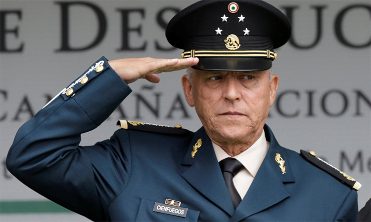 “Đại sứ Mexico Christopher Landau vừa thông báo cho tôi rằng cựu Bộ trưởng Quốc phòng, Tướng Salvador Cienfuegos, đã bị bắt tại sân bay ở Los Angeles, California.” Ngày 15 tháng 10 — Ebrard nói, Ông không biết về những cáo buộc của các quan chức Mỹ chống lại Tướng Channfugos và khẳng định rằng ông sẽ hỗ trợ lãnh sự cho công dân này. Đồng thời, Reuters dẫn nguồn tin ngoại giao Mexico cho biết Cienfuegos đã bị bắt theo yêu cầu của Cơ quan Phòng chống Ma túy Hoa Kỳ (DEA). Salvador Cienfuegos nhậm chức Bộ trưởng Quốc phòng Mexico vào tháng 9 năm 2016 tại một sự kiện ở Mexico City. : Reuters.