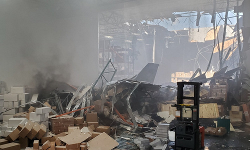 Xác chiếc máy bay nằm trong đống đổ nát của nhà kho. Ảnh: Twitter.
