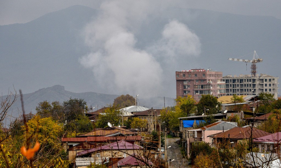 Vào ngày 6 tháng 11, khói dày bùng lên sau vụ đánh bom ở Stepanakert, thủ phủ của vùng Nagorno-Karabakh. Ảnh: Agence France-Presse.