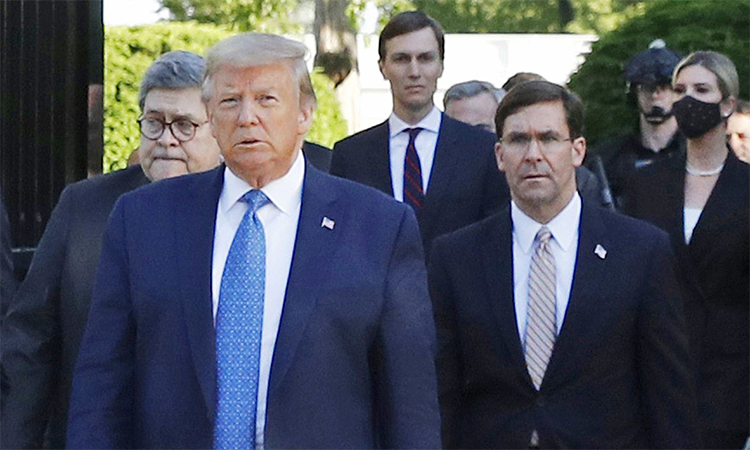 Vài tháng trước, Lầu Năm Góc và Nhà Trắng dự đoán rằng Trump sẽ sa thải Esper. Các phương tiện truyền thông Mỹ đã dự đoán rằng Esper sẽ từ chức trước khi bị sa thải, nhưng khi cuộc bầu cử đến gần, không bên nào dẫn đầu. Trước ngày bỏ phiếu. Lần cuối cùng ông chủ trì cuộc họp giao ban Lầu Năm Góc là vào cuối tháng Bảy. Esper tiếp tục đi cùng các phóng viên trong và ngoài nước, nhưng từ chối tham gia các video phỏng vấn. Tổng thống Mỹ Donald Trump (trên cùng bên trái) và Bộ trưởng Quốc phòng Mark Esper (sau bên phải, Trump) tham dự Nhà thờ Thánh. Bishop John, ngày 2 tháng 6. Ảnh: Associated Press.