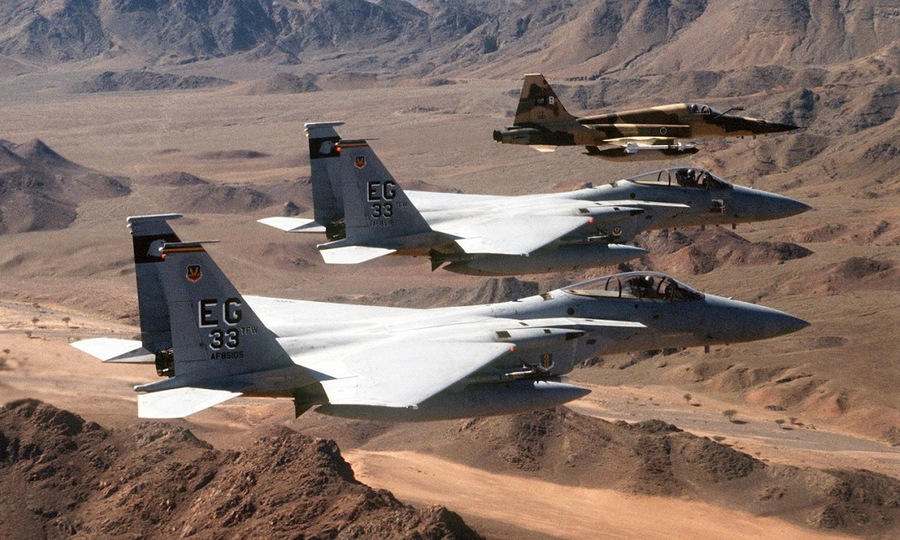 Ngày 16/1/1991, Tổng thống Mỹ George H. W. Bush phát động chiến dịch quân sự “Bão táp sa mạc” nhằm đánh đuổi quân đội Iraq ra khỏi lãnh thổ Kuwait. Một ngày sau, một phi đội máy bay chiến đấu F-15 của Mỹ lọt vào trận địa phục kích rất phức tạp của lực lượng phòng không Iraq, nhưng đã thoát được và thành công với máy bay chiến đấu của đối phương. Tháng 8/1990, Iraq đưa quân tấn công Kuwait để thôn tính vùng lãnh thổ giàu dầu mỏ của nước này. Sau đó, Tổng thống Bush ra lệnh triển khai bộ binh, hải quân và không quân tới Tây Nam Á để ổn định tình hình và thuyết phục Tổng thống Iraq Saddam Hussein từ chức. -15C bay cùng các máy bay chiến đấu của Ả Rập Xê Út trong khuôn khổ chiến dịch “Lá chắn sa mạc”. Ảnh: USAF .