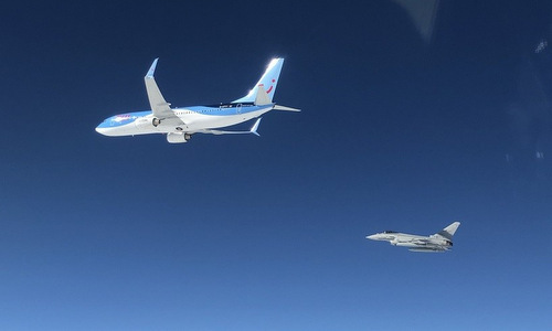 Máy bay Boeing 737 (trái) được hộ tống bởi Hạm đội Typhoon. Ảnh: ItAF .