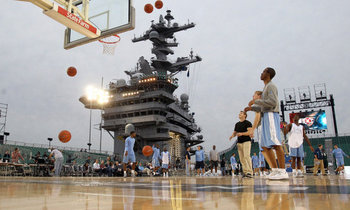 Vào ngày 11 tháng 11 năm 2011, một trò chơi bóng rổ đã được chơi trên sàn buồng lái của hàng không mẫu hạm USS Carl Vinson và sau đó neo đậu tại cảng quân sự. San Diego, Hoa Kỳ. Theo báo cáo trên Thời báo Los Angeles, cựu Tổng thống Hoa Kỳ Barack Obama là một trong số 8.111 người trong sân vận động trong buồng lái máy bay của Carl Vinson.
