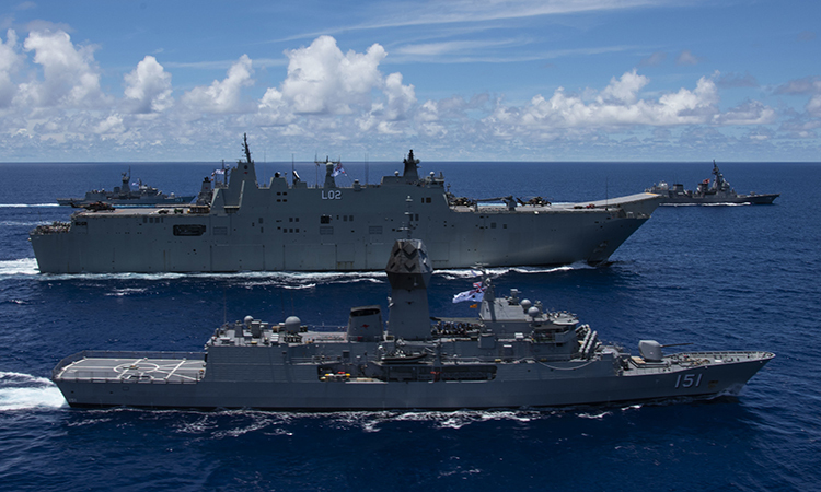 Vào ngày 28 tháng 7, Bộ trưởng Ngoại giao Marise Payne và Bộ trưởng Quốc phòng Úc Linda Reynold đã tham gia cùng các đối tác Mỹ Mike Pompeo và Mark Esper tại Washington, DC. Esper) đã đàm phán như là một phần của các cuộc tham vấn cấp bộ hàng năm giữa Mỹ và Úc. Trong cuộc họp, hai nguyên thủ quốc gia tập trung vào Trung Quốc, chỉ trích Bắc Kinh thực thi luật an ninh Hồng Kông, đảm bảo hợp tác để ngăn chặn sự lan truyền thông tin sai lệch và ký tuyên bố chính sách mới về tăng cường quan hệ quốc phòng và hợp tác trong lĩnh vực phát triển và y tế. — Tuy nhiên, Úc không đồng ý với ý kiến của Hoa Kỳ và Hoa Kỳ kêu gọi tăng tần suất tự do tuần tra hàng hải ở Biển Đông. Khi được hỏi liệu Hoa Kỳ có thúc giục Úc đưa tàu chiến bất hợp pháp từ các lực lượng chiếm đóng của Trung Quốc xuống biển hay không, Ngoại trưởng Reynold trả lời rằng đây là vấn đề được thảo luận về vụng trộm và hai bên dường như không đạt được thỏa thuận. Chúng tôi sẽ duy trì một phong cách nhất quán. Chúng tôi sẽ tiếp tục đi du lịch trong các khu vực tuân thủ luật pháp quốc tế. “Vào ngày 21 tháng 7, tàu sân bay HMAS Arunta (cũ) của Úc, tàu sân bay trực thăng HMAS Canberra (giữa) của Úc và tàu khu trục Nhật Bản Teruzuki đang luyện tập ở vùng biển Philippines. Ảnh: Hải quân Hoa Kỳ.