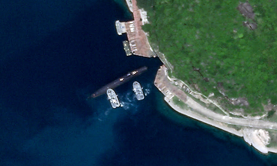 Hình ảnh vệ tinh do Planet Labs công bố ngày 19/8 cho thấy khu vực neo đậu tàu ngầm của Căn cứ Hải quân Du Lâm trên đảo Hải Nam, nơi đặt hạm đội tên lửa đạn đạo phóng từ tàu ngầm chiến lược. Trung Quốc. Cầu tàu mở hoàn toàn trống rỗng, tàu ngầm Type 093 đi vào cửa sập gần đó với sự hỗ trợ của hai tàu lai dắt.